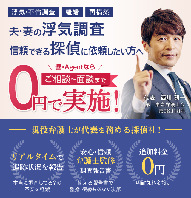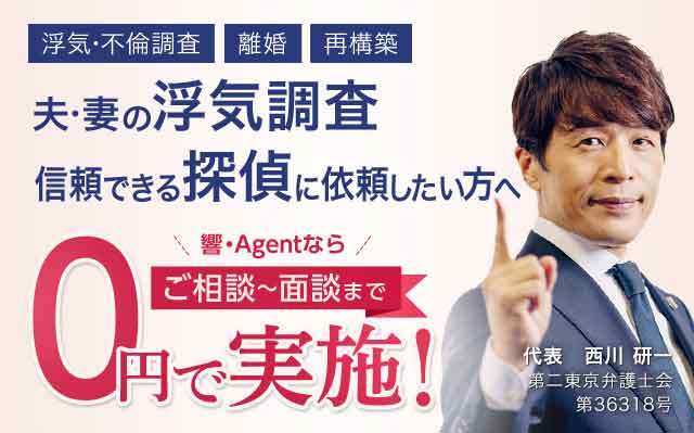 響・Agentは、弁護士が運営する浮気・不倫調査専門の探偵社です。相談員が状況を整理し、必要なら調査員との無料面談でプランと見積りを提示。調査中は可能な限りリアルタイム報告、調査後は弁護士監修の報告書で「離婚・慰謝料請求など次の手続き」を見据えた動き方まで相談できます。